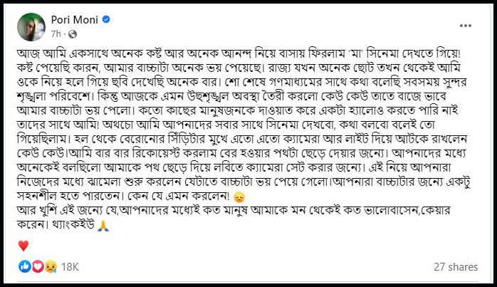 অভিনেত্রী লেখেন, ‘আজ আমি একসঙ্গে অনেক কষ্ট আর অনেক আনন্দ নিয়ে বাসায় ফিরলাম ‘মা’ সিনেমা দেখতে গিয়ে। কষ্ট পেয়েছি কারণ, আমার সন্তান অনেক ভয় পেয়েছে। রাজ্য যখন অনেক ছোট তখন থেকেই আমি ওকে নিয়ে হলে গিয়ে সিনেমা দেখেছি অনেকবার। শো শেষে গণমাধ্যমের সঙ্গে কথা বলেছি, সবসময় সুন্দর শৃঙ্খলা পরিবেশে।’