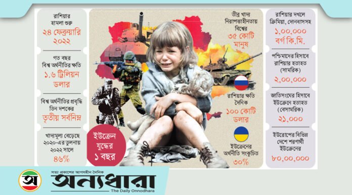 রাশিয়ার মতো বিশাল শক্তির বিরুদ্ধে মরণপণ লড়াইয়ে ইউক্রেন অভাবনীয় প্রতিরোধ দেখালেও অব্যাহত হামলায় দেশটি এখন কার্যত ধ্বংসস্তূপ। দেশটির অর্থনীতির ৩০ শতাংশ সংকুচিত হয়েছে। রাশিয়ার ক্ষতিও কম হয়নি। এক সময়ের পরাশক্তি দেশটি এখন কার্যত একঘরে। জাতিসংঘের সাধারণ পরিষদে তার পক্ষে পাঁচটির বেশি ভোট পড়ে না। অর্থনীতিতে ধস না নামলেও দীর্ঘমেয়াদি ক্ষতির মুখে পড়েছে দেশটি। রাশিয়ার হাজার হাজার (পশ্চিমাদের মতে দুই লাখ) সেনা হতাহত হয়েছে। ধ্বংস হয়েছে অর্ধেক সংখ্যক ট্যাঙ্ক।