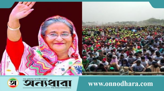 কিশোরগঞ্জের মিঠামইন উপজেলা সদরের হেলিপ্যাড মাঠের সুধী সমাবেশে এসে পৌঁছেছেন প্রধানমন্ত্রী শেখ হাসিনা। তাঁর উপস্থিতির সঙ্গে সঙ্গে নেতাকর্মীদের স্লোগানে মুখরিত হয়ে ওঠে চারপাশ। প্রধানমন্ত্রী হাত নেড়ে সবাইকে শুভেচ্ছা জানান। আজ (২৮ ফেব্রুয়ারি, মঙ্গলবার) দুপুর ২টা ৪০ মিনিটে প্রধানমন্ত্রী সুধী সমাবেশ মঞ্চে ওঠেন এবং প্রধান অতিথির আসন গ্রহণ করেন। প্রধানমন্ত্রীকে মঞ্চে দেখে উচ্ছ্বসিত হয়ে ওঠেন সমাবেশে অংশ নেওয়া লাখো মানুষ। এসময় তারা নানা স্লোগান দিয়ে প্রধানমন্ত্রীকে স্বাগত জানান।