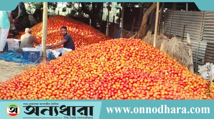 পাইকাররা টমেটো কিনে আড়তে ঢালছেন। প্রতিটি আড়তে ১০-৩০ জন শ্রমিক টমেটো বাছাই করে ক্যারেটে (ঝুড়ি) ভরছেন। কেউ ট্রাকে মাল তুলছেন, কেউ চাষিদের কাছ থেকে মাল বুঝে নিয়ে টাকা পরিশোধ করছেন। টমেটো সাধারণত শীতকালীন রবি মৌসুমের ফসল। অক্টোবরের মাঝামাঝি সময়ে চারা লাগানো হয়। তবে গত কয়েক বছর থেকে দিনাজপুরে খরিপ-১ মৌসুমেও আগাম টমেটোর চাষ হচ্ছে। এক্ষেত্রে কৃষক আমন ধান কাটার পরে বোরো ধান না লাগিয়ে টমেটো চাষ করছেন। জেলা কৃষি সম্প্রসারণ অধিদপ্তর সূত্রে জানা যায়, গত অর্থবছরে জেলায় ৯৫৫ হেক্টর জমিতে টমেটোর আবাদ হয়েছে। উৎপাদন ছিল ৪৬ হাজার ৫৫৩ মেট্রিক টন। এবার টমেটো আবাদ হয়েছে ১ হাজার ১০২ হেক্টর জমিতে। উৎপাদনের লক্ষ্যমাত্রা ধরা হয়েছে প্রায় ৫০ হাজার মেট্রিক টন। জেলার সবচেয়ে বেশি পরিমাণ ৬০ শতাংশ টমেটোর চাষ হয় সদর উপজেলা, চিরিরবন্দর ও বীরগঞ্জ উপজেলায়।