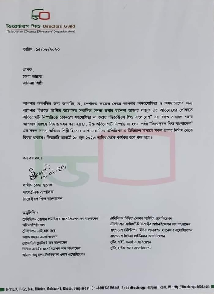 বিবৃতিতে বলা হয়েছে, পেশাগত কাজের ক্ষেত্রে আপনার অসহযোগিতা ও অসদাচরণের জন্য আপনার বিরুদ্ধে আনীত আমাদের সম্মানিত সদস্য রাশেদা আক্তার লাজুকের অভিযোগের প্রেক্ষিতে অভিযোগটি নিষ্পত্তিতে কোনোরূপ সহযোগিতা না করায় ডিরেক্টরস গিল্ড বাংলাদেশের সকল সদস্য অভিনয়শিল্পী হিসেবে আপনাকে টেলিভিশন ও ডিজিটাল মাধ্যমে সকল প্রকার নির্মাণ থেকে বিরত থাকবে। সিদ্ধান্তটি আগামী ২০ জুন ২০২৩ থেকে কার্যকর বলে গণ্য হবে।