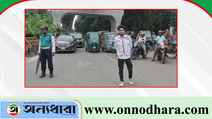 সোমবার (১২ আগস্ট) সকাল থেকে পুলিশ সদস্যরা ট্রাফিক নিয়ন্ত্রণে যোগ দেন। পুলিশের পাশাপাশি রাস্তায় শিক্ষার্থীরাও দায়িত্বপালন করছেন।