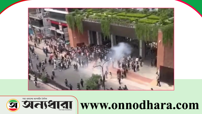 এর আগে সকাল সাড়ে ১০টার পরে রাস্তায় অবস্থান নেয় কোটা সংস্কারের দাবিতে আন্দোলনরত শিক্ষার্থীরা। বেলা পৌনে ১১টার দিকে পুলিশের সঙ্গে শিক্ষার্থীদের পাল্টাপাল্টি ধাওয়া শুরু হয়। এক পর্যায়ে বেলা ১১টার দিকে পুলিশ কানাডিয়ান ইউনিভার্সিটি অফ বাংলাদেশের ভেতরে ঢুকে যায়। বাইরে আন্দোলনকারীরা অবস্থান নিয়েছে। সেখানে বেশ কয়েকটি দোকানপাট, স্থাপনায় ভাঙচুর চালানো হয়।