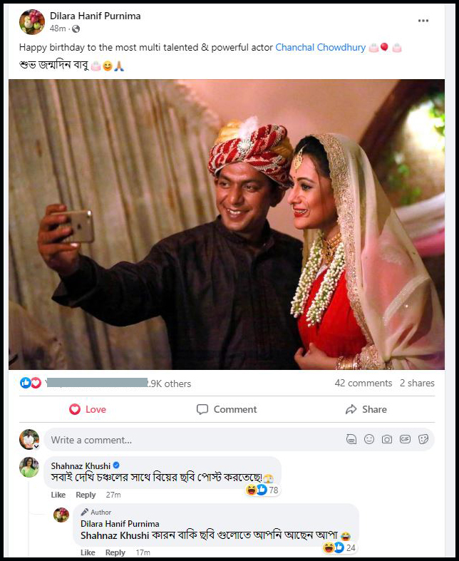 এছাড়া চিত্রনায়িকার পোস্ট করা ছবিতে দেখা যায় একটি বিয়ের সাজে রয়েছেন চঞ্চল-পূর্ণিমা। যেখানে অভিনেত্রীকে নববধূ সাজে এবং চঞ্চল চৌধুরীকে বর সাজে দেখা গেছে। আর এ ছবিটি কোনো শুটিংয়ের সময় তোলা।