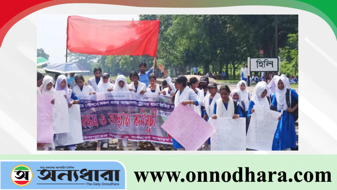 সব ট্রেনের যাত্রাবিরতি ও রেলপথে আমদানিকৃত পণ্য খালাসের দাবিতে দিনাজপুরের হিলিতে রেলপথ অবরোধ করে বিক্ষোভ করেছেন শিক্ষার্থীরা। এতে দেড়ঘণ্টা উত্তরবঙ্গের সঙ্গে ঢাকার ট্রেন চলাচল বন্ধ হয়ে যায়। তীব্র গরমে ভোগান্তিতে পড়েন যাত্রীরা। পরে কর্তৃপক্ষের আশ্বাসে অবরোধ তুলে নিলে ট্রেন চলাচল স্বাভাবিক হয়।